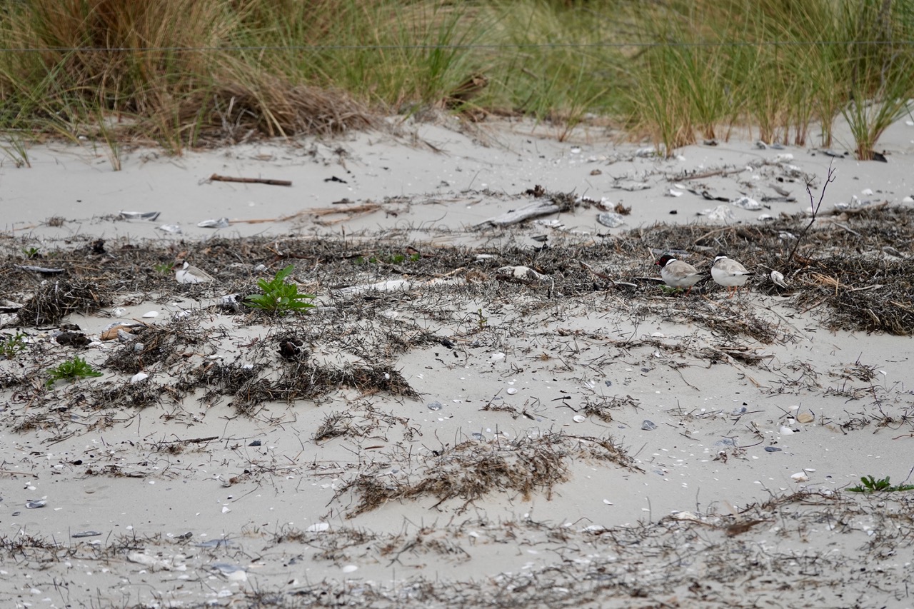 Good news, I counted at least 32 adult terns sitting on the sand, most nestled down into the sand, likely in a nest scrape, with other Terns flying in and out. I say at least 32, because there was a section of the colony behind sandbags and sedges that I couldn’t see, but there were terns flying in and out from this area, so clearly additional birds.