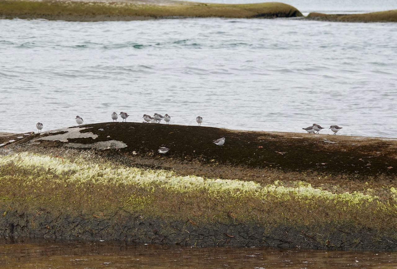 After - Part of the raised area with seaweed increasing the surface texture and diversity. Before we had even finished spreading the seaweed a flock of 12 Hooded Plovers flew in landed on the sandbags and came across to explore and feed amongst the seaweed (11 in the image), along with two Red-capped Plovers.